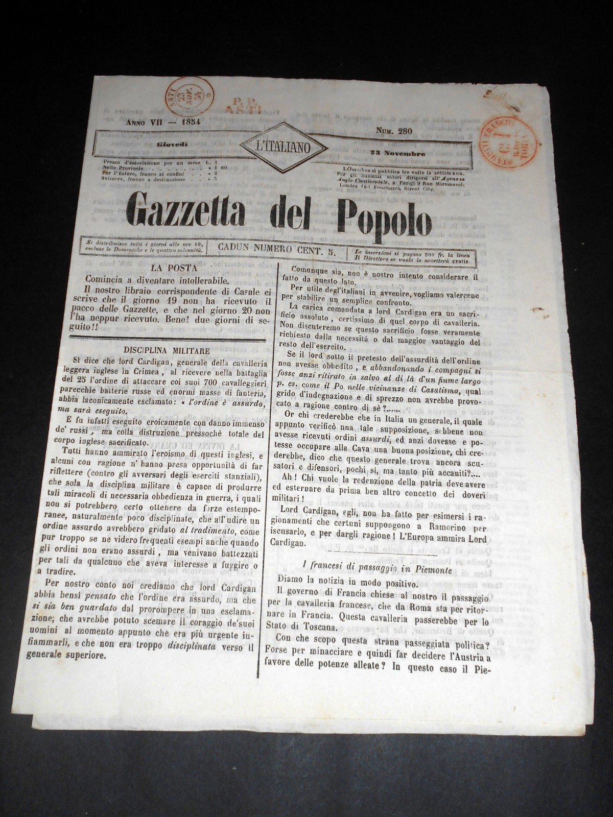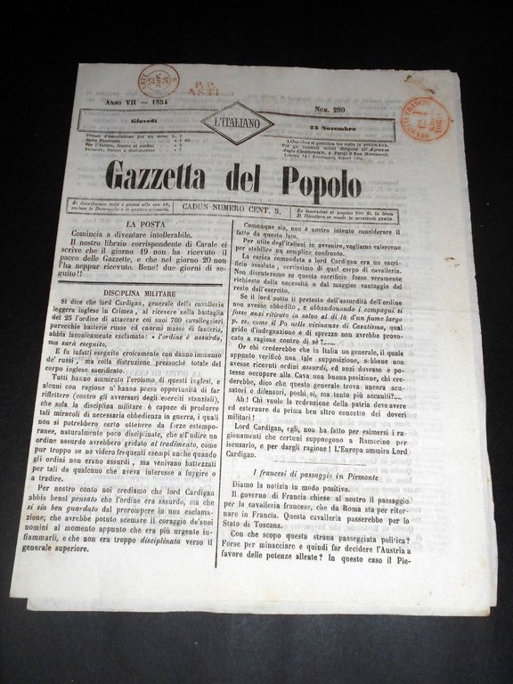 Risorgimento Cavour Torino - Giornale Gazzetta del Popolo n° 280 del 1854 | Libri antichi e moderni |