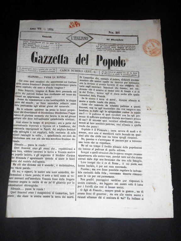 Risorgimento Cavour Torino - Giornale Gazzetta del Popolo n° 295 del 1854 | Libri antichi e moderni |