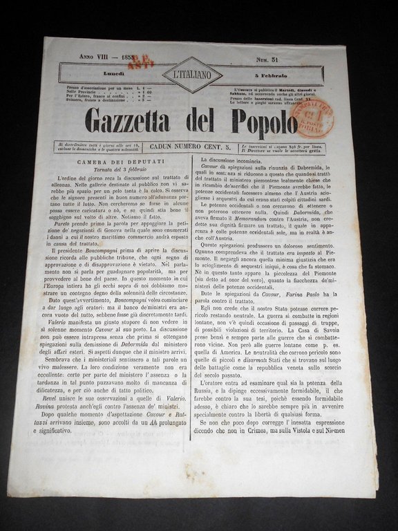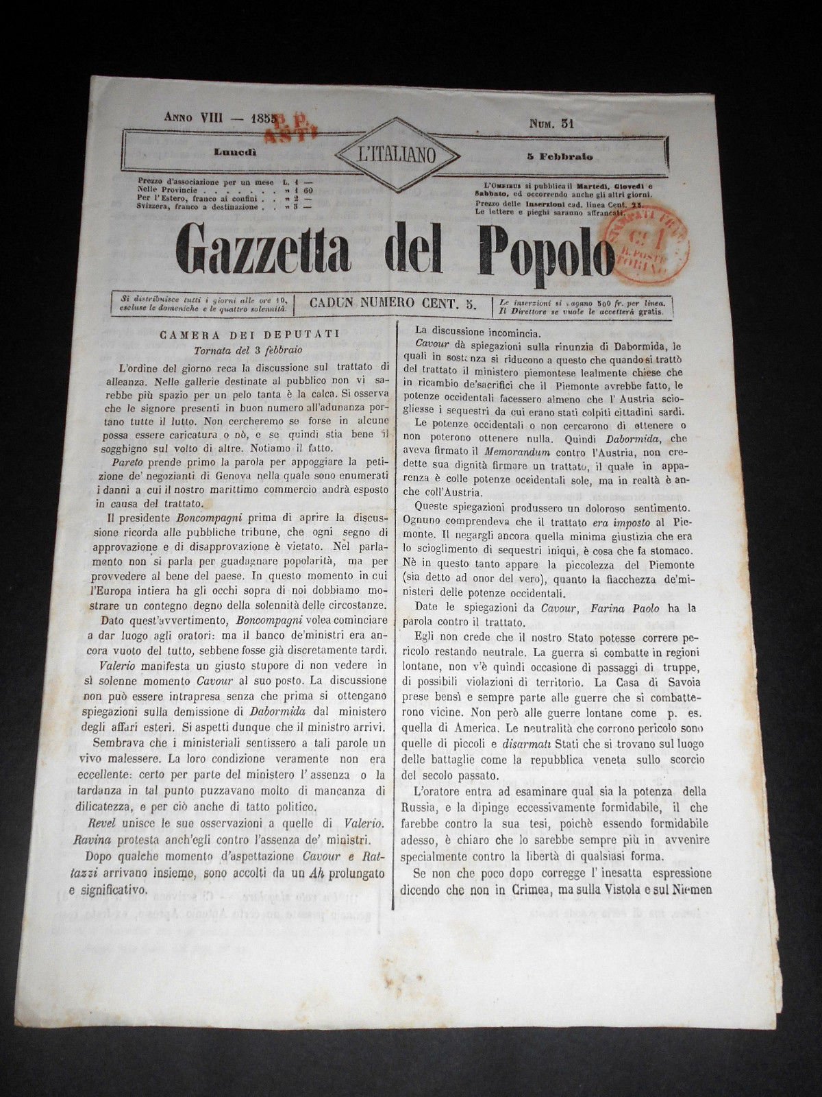 Risorgimento Cavour Torino - Giornale Gazzetta del Popolo n° 31 del 1855 | Libri antichi e moderni |
