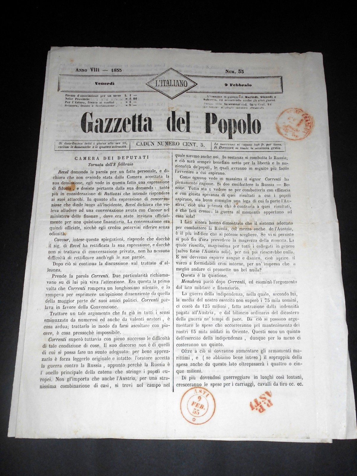 Risorgimento Cavour Torino - Giornale Gazzetta del Popolo n° 35 del 1855 | Libri antichi e moderni |