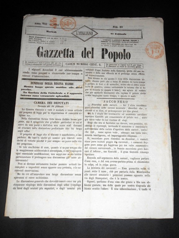Risorgimento Cavour Torino - Giornale Gazzetta del Popolo n° 50 del 1855 | Libri antichi e moderni |