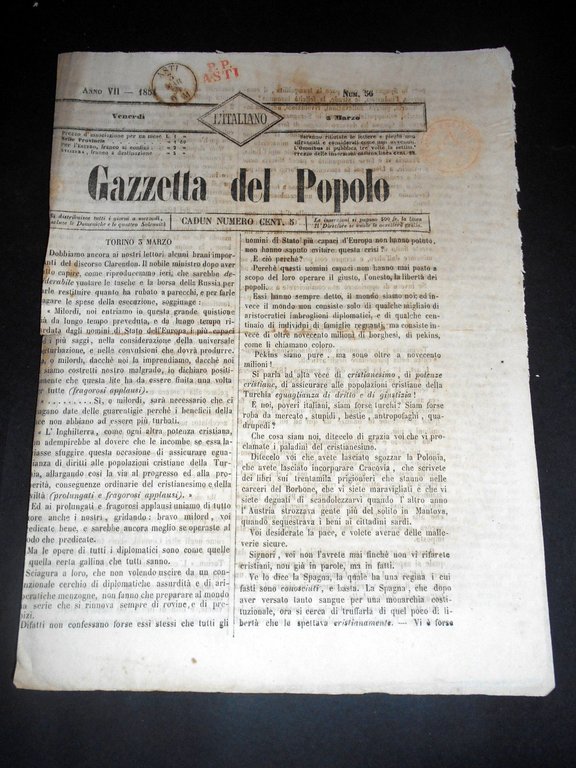 Risorgimento Cavour Torino - Giornale Gazzetta del Popolo n° 56 del 1854 | Libri antichi e moderni |