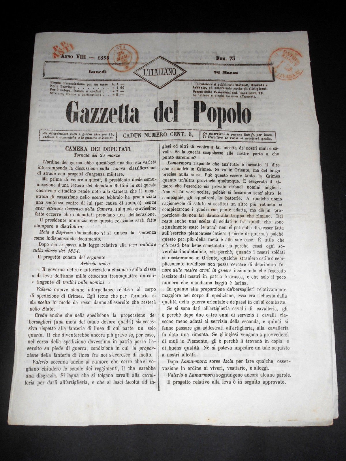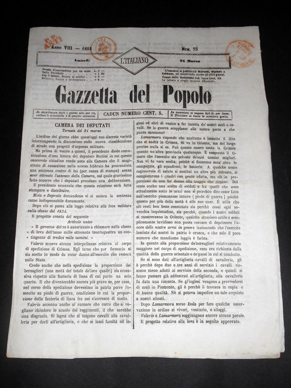 Risorgimento Cavour Torino - Giornale Gazzetta del Popolo n° 73 del 1855 | Libri antichi e moderni |