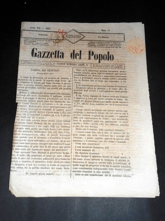 Risorgimento Cavour Torino - Giornale Gazzetta del Popolo n° 74 del 1854 | Libri antichi e moderni |