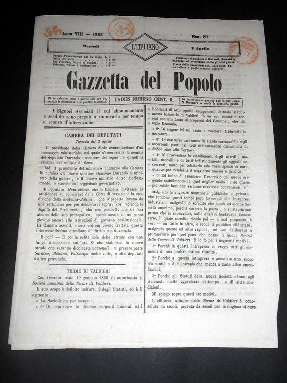 Risorgimento Cavour Torino - Giornale Gazzetta del Popolo n° 80 del 1855 | Libri antichi e moderni |
