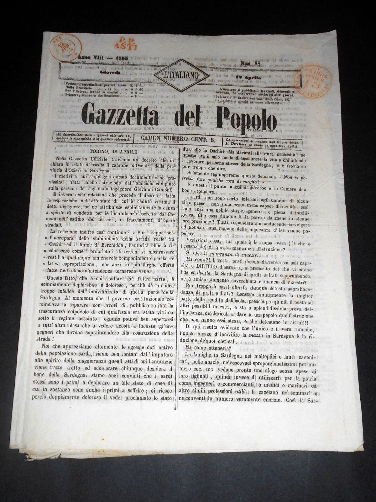 Risorgimento Cavour Torino - Giornale Gazzetta del Popolo n° 88 del 1855 | Libri antichi e moderni |