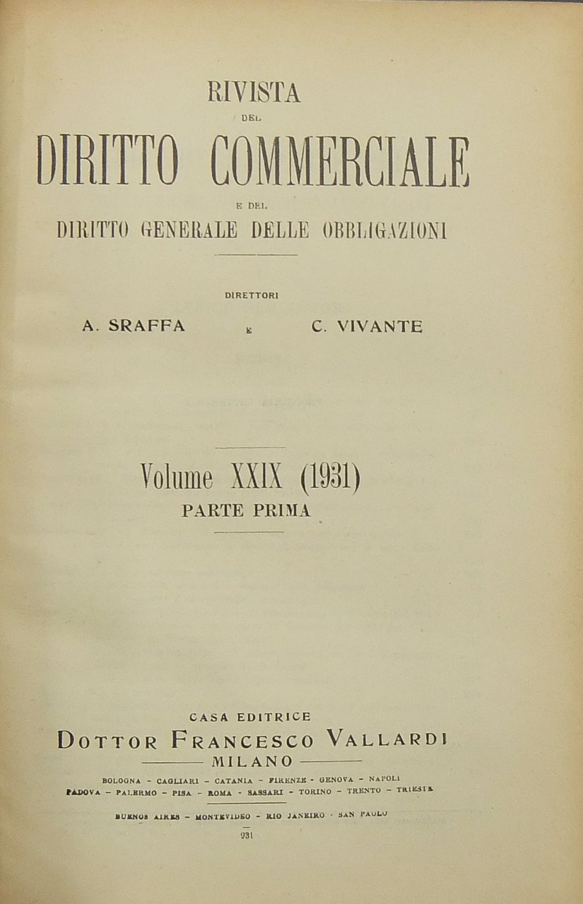 Rivista del Diritto Commerciale e del diritto generale delle obbligazioni. Diretta da A. Sraffa e C. Vivante. Vol. XXIX - 1931 | Libri antichi e moderni | Autori Vari