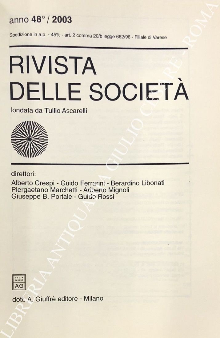 Rivista delle società. Fondata da Tullio Ascarelli. Diretta da Alberto Crespi, Guido Ferrarini, Berardino Libonati, Piergaetano Marchetti, Ariberto Mignoli, Giuseppe B. Portale, Guido Rossi. Anno 48° - 2003 | Libri antichi e moderni | D'Alessandro F. - Di Sabato F. - Enriques L. - Pavone La Rosa A., - Rescio G.A. - Rossi G. - Salanitro N. - Santagata R. - Zanaro, Ne G. Et Alii