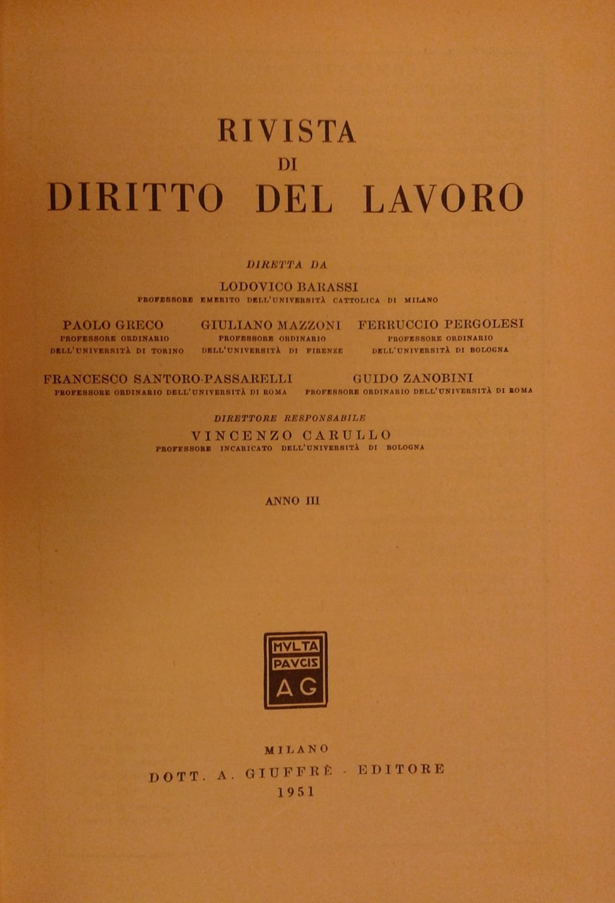Rivista di diritto del lavoro. Anno III - 1951 | Libri antichi e moderni | Autori Vari