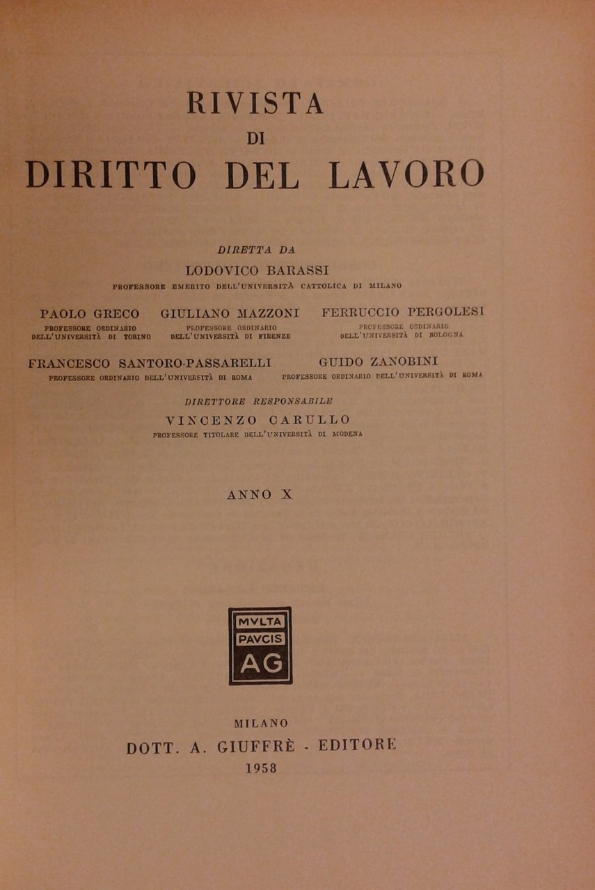 Rivista di diritto del lavoro. Anno X - 1958 | Libri antichi e moderni | Autori Vari