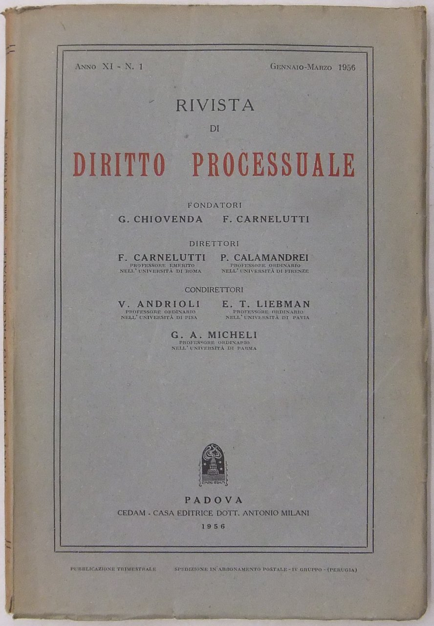 Rivista di Diritto Processuale. Annata 1956. Diretta da: Francesco Carnelutti, Giuseppe Chiovenda, Piero Calamandrei, Enrico Tullio Liebman. Anno XI (Seconda Serie) | Libri antichi e moderni | Andrioli V. - Ascarelli T. - Calamandrei P. - Cappelletti M. - C, Arnelutti F. - Micheli G.A. - Montesano L. Et Alii