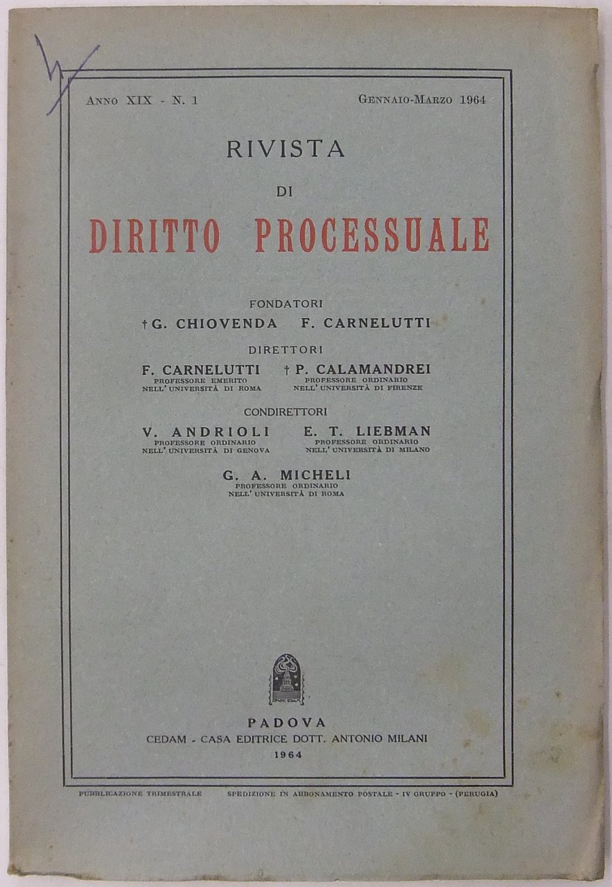 Rivista di Diritto Processuale. Annata 1964. Diretta da: Francesco Carnelutti, Giuseppe Chiovenda, Piero Calamandrei, Enrico Tullio Liebman. Anno XIX (Seconda Serie) | Libri antichi e moderni | Andrioli V. - Carnelutti F. - Colesanti V. - Costa S. - Garbagna, Ti E. - Liebman E.T. - Mandrioli C. - Micheli G.A. - Montesano L, . Et Alii