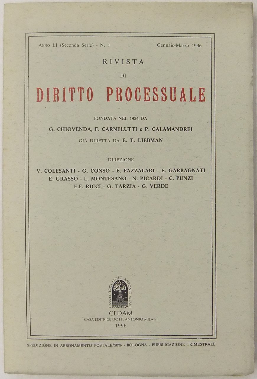 Rivista di Diritto Processuale. Annata 1996. Diretta da: Francesco Carnelutti, Giuseppe Chiovenda, Piero Calamandrei, Enrico Tullio Liebman. Anno LI (Seconda Serie)
