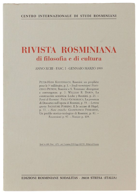 RIVISTA ROSMINIANA DI FILOSOFIA E DI CULTURA. Fasc. I/1999. | Libri antichi e moderni | Centro Internazionale Studi Rosminiani.