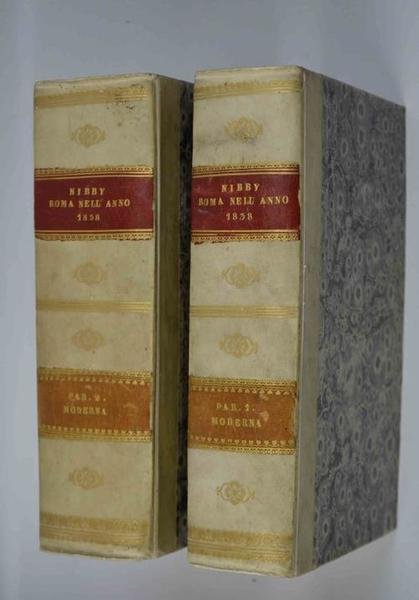 Due volumi di cm. 22, pp. xiv, 783 (1); (6) 1016 (2). Con 30 belle tavole f.t. incise in rame. Solida ed elegante legatura coeva in mezza pergamena, dorsi lisci con fregi, filetti e titoli in oro su tasselli. Esemplare particolarmente fresco e ben conservato, in perfetto stato di conservazione. Si tratta delle sole due parti riguardanti Roma moderna che furono preceduta da altrettanti volumi per Roma antica. Cfr. Rossetti, I, 1617; Fossati Bellani, 861