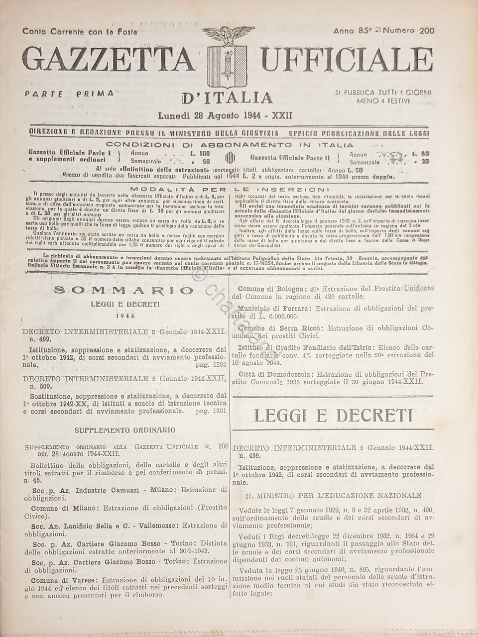 RSI Gazzetta Ufficiale d'Italia N. 200 - 1944 Testo in lingua italiana, Pag. 20 Condizioni buone