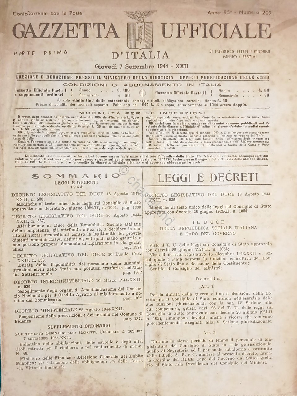 RSI Gazzetta Ufficiale d'Italia N. 209 - 1944