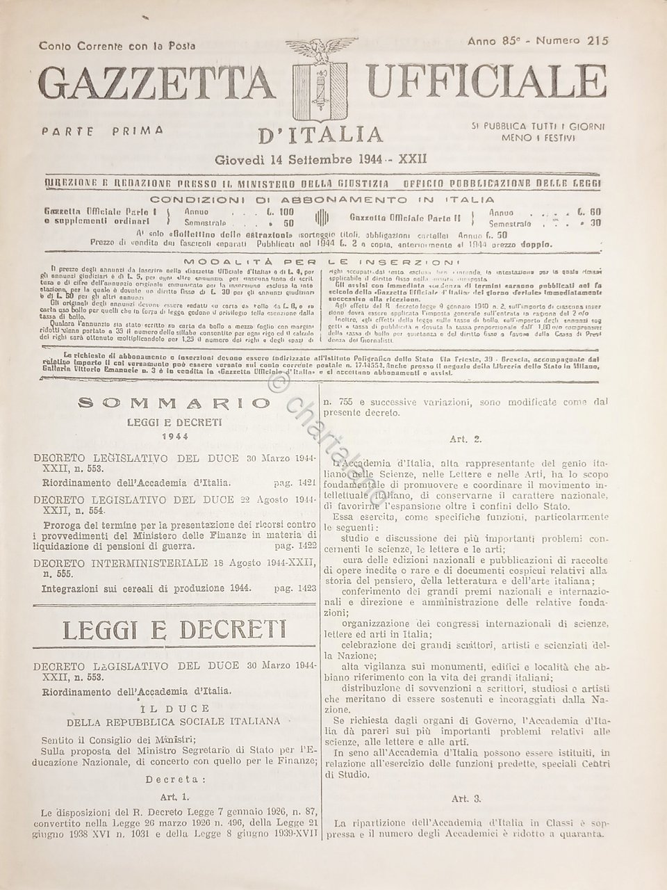 RSI Gazzetta Ufficiale d'Italia N. 215 - 1944