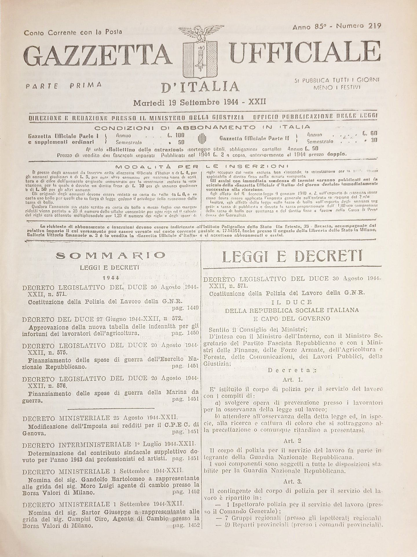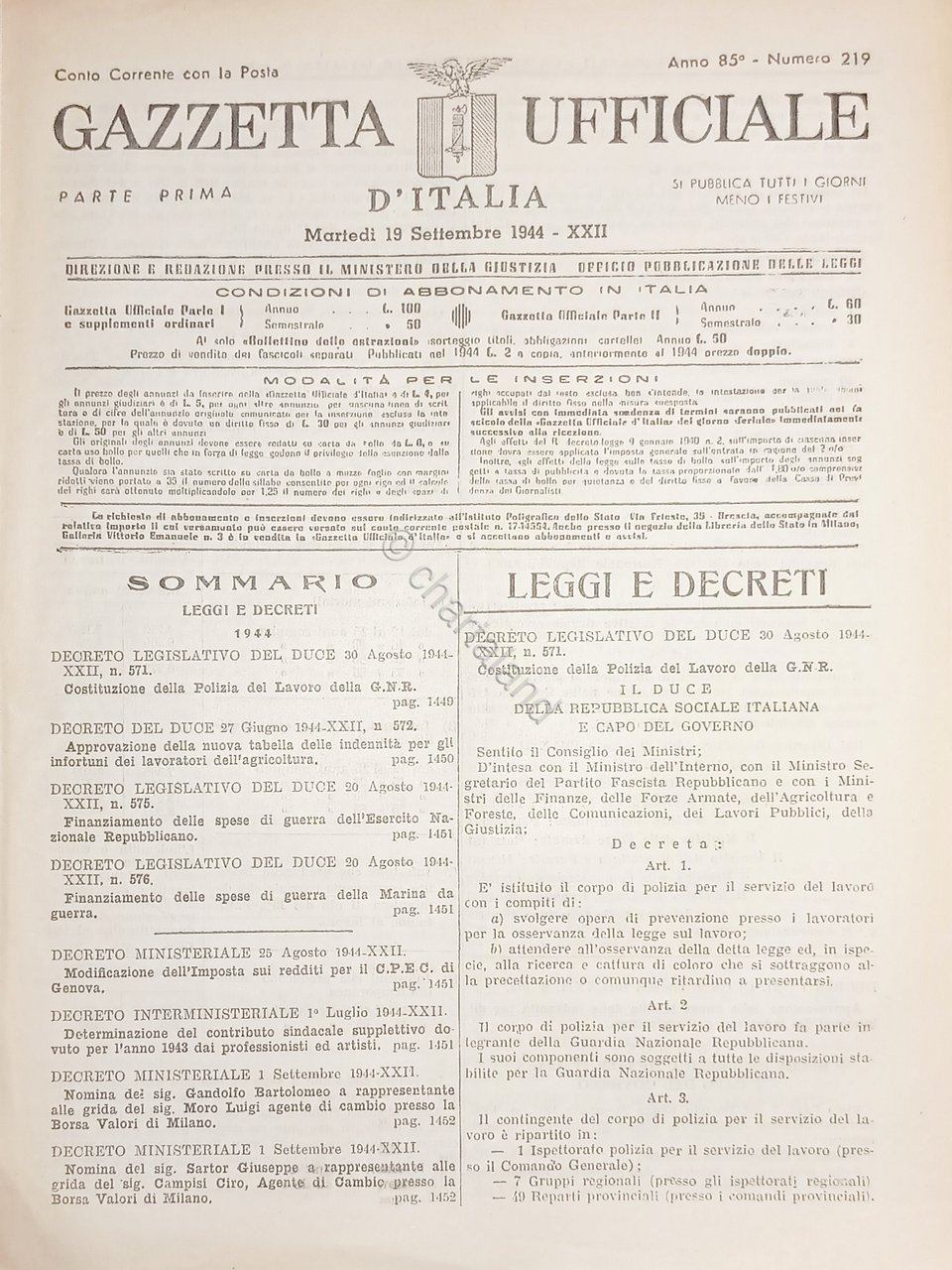 RSI Gazzetta Ufficiale d'Italia N. 219 - 1944