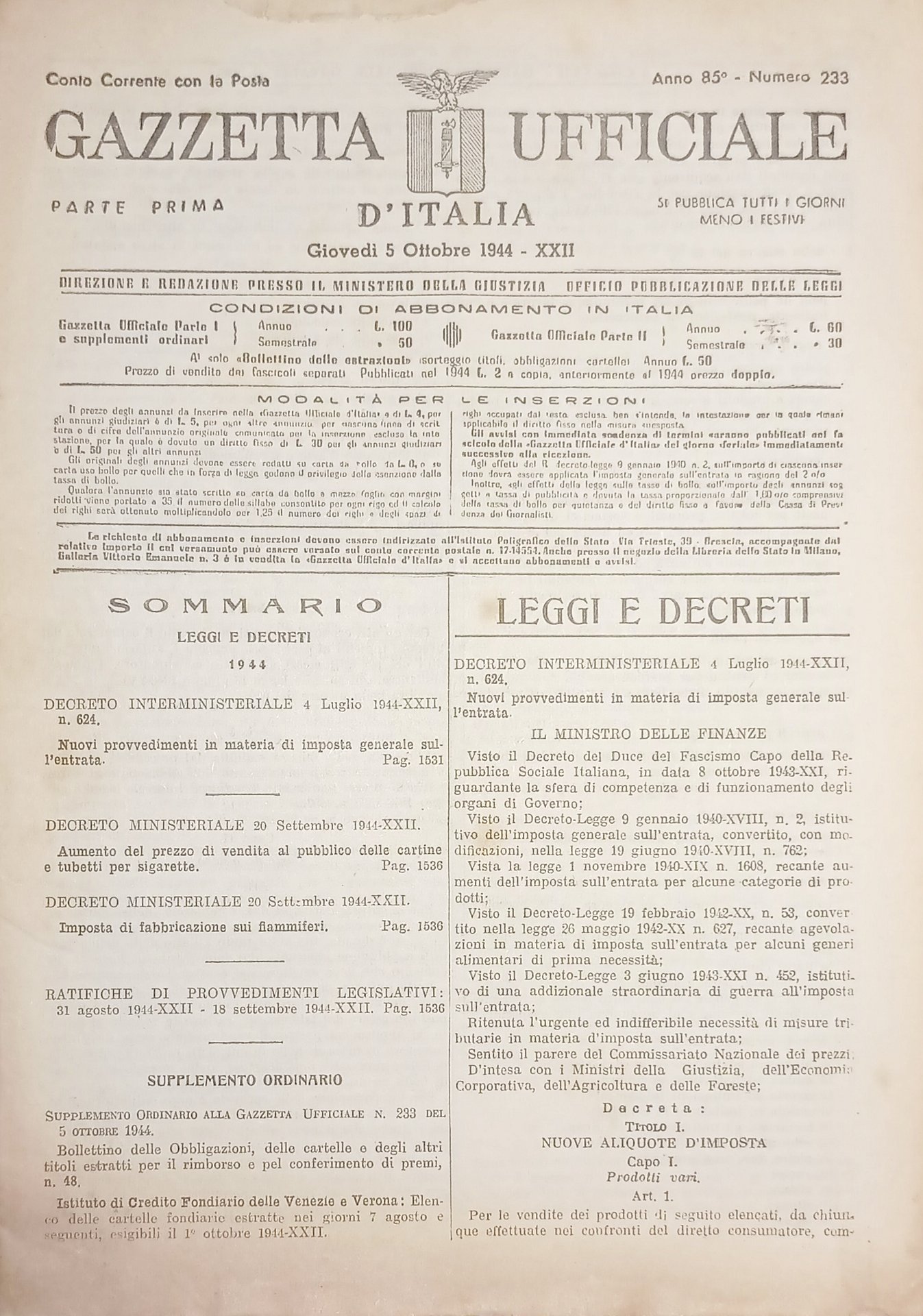 RSI Gazzetta Ufficiale d'Italia N. 233 - 1944
