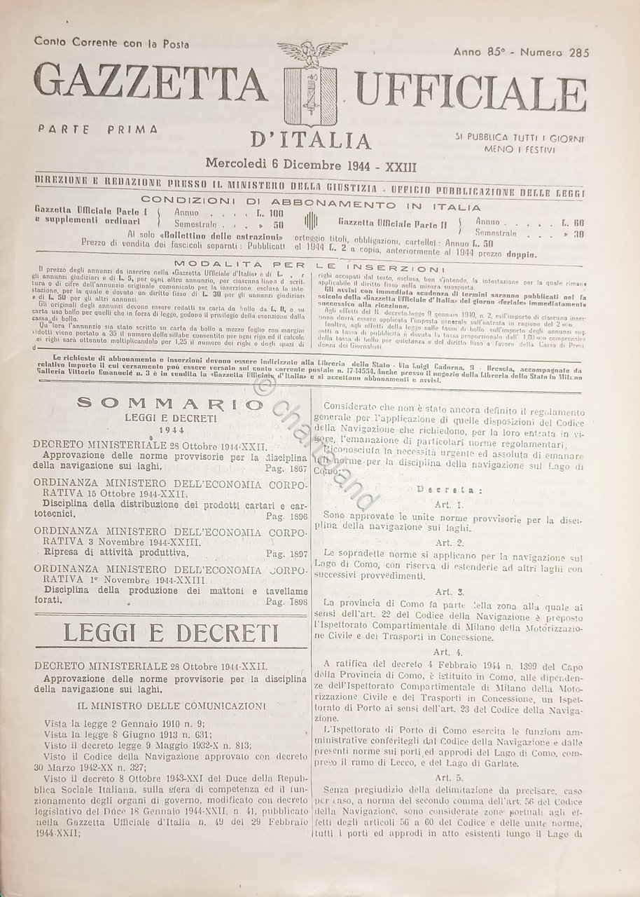 RSI Gazzetta Ufficiale d'Italia N. 285 - 1944 Testo in lingua italiana, Pag. 30 Condizioni buone