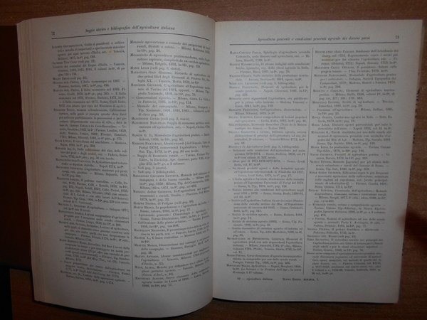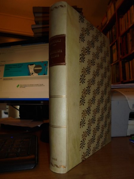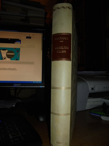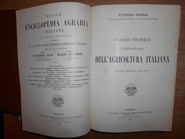 Vittorio, Niccoli. Torino, Unione Tipografico-Editrice, 1902. Saggio Storico e bibliografico Dell' Agricoltura Italiana dalle origini al 1900. In-8° grande, m. pergamena con angoli, fregi e titolo in oro al dorso. 575 pp. testo su due colonne. Ottimo esemplare con timbretto ex Libris. Uff. C - II - 1
