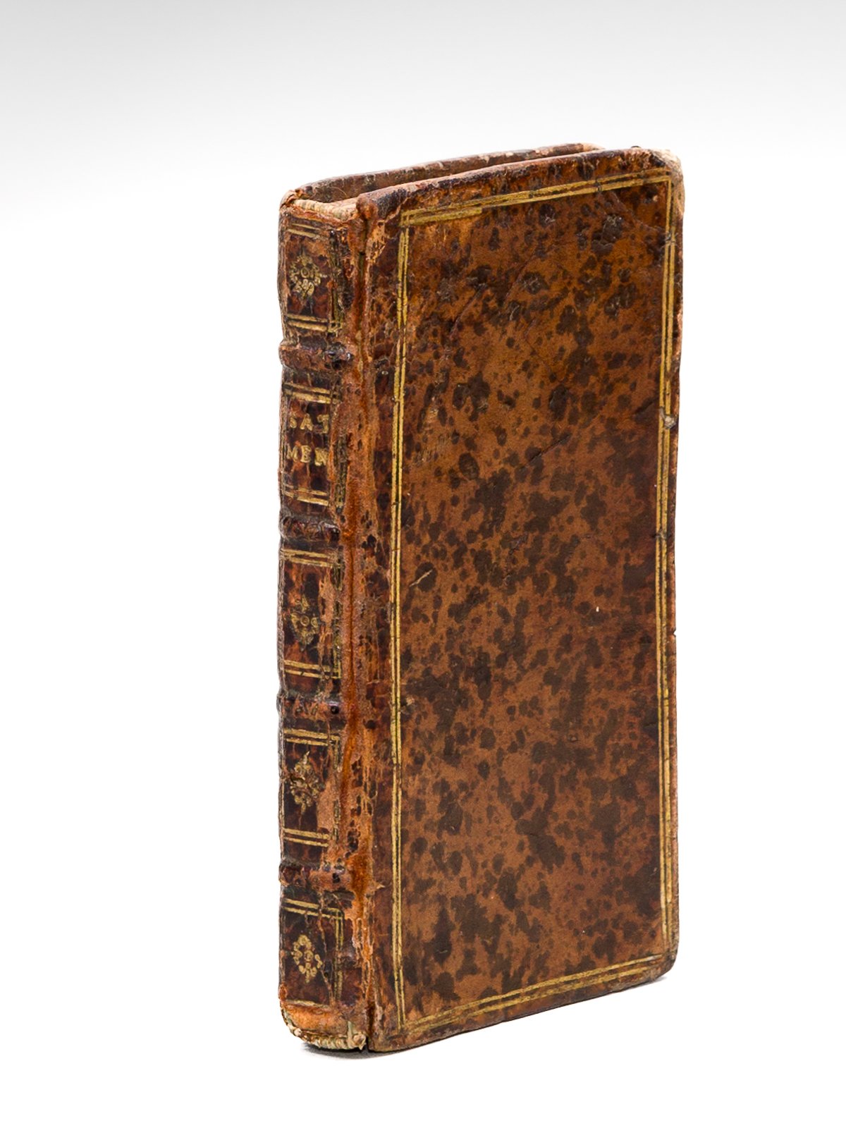Plus le Regret sur la mort de l'Asne Ligueur d'une Damoyselle, qui mourut durant le siège de Paris, 1 vol. petit in-12 reliure de l'époque plein veau arbré, dos à 4 nerfs orné, double filet doré orné, s.l., s.n., 1649, 206 pp. Rare exemplaire de belle provenance pour cette édition à propos de laquelle on cite le commentaire de Willems : "Les Elzevier n'ont pas imprimé la Satyre Ménippée. [ . ] Mais l'édition de 1649 est plus rare ; elle est d'ailleurs très bien imprimée en petits caractères. Motteley l'attribue aux presses de G. de Hoeve de Gouda. En ce cas celui-ci l'aurait exécutée pour le compte d'un autre libraire, puisqu'elle est citée avec l'adresse de Leyde dans le catal. de 1674" (Willems 1659). L'exemplaire provient de la bibliothèque de Mercier du Rocher (avec son ex-libris ms. "ex bibliotheca A.C.Fr. Mercier du Rocher, Rupellensis, 1784"). Né à La Rochelle, André-Charles-François Mercier du Rocher (1753-1816) est bien connu pour son parcours politique mais également pour son Journal ainsi que pour ses Mémoires, source importante pour l'histoire de la Révolution Française en Vendée. Il a ajouté quelques annotations manuscrites, notamment une longue note in fine relative à l'ouvrage à propos duquel il conclut : "On prétend que cette pièce a plus contribué à la destruction de la Ligue que les armes d'un roi Henri quatre ; c'est bien le cas de dire avec Horace : "Ridiculum acri melius plerumque secat res". Etat très satisfaisant (manques en coiffes, reliure frottée, ex-libris ms. "ex bibliotheca A.C.Fr. Mercier du Rocher, Rupellensis, 1784").
