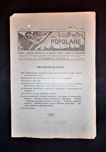 ***Scienza e Tecnica - Elettrotecnica - L'elettricità popolare - N. 148 - Anno VII - Torino, 25 Aprile-9 Maggio 1910 - Periodico quindicinale illustrato per gli Operai e Studiosi di Elettrotecnica - Pag. 15Interessante pubblicazione, fonte ricchissima di informazioni per studiosi, appassionati e collezionisti