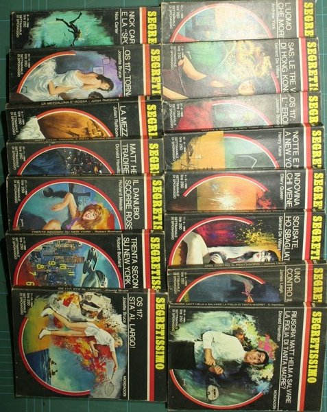 Settimanale di spionaggio - Nn. 296-297-299/304-306-309-310-312/315 - in 16° - pp.Circa 140 pagine a volume - Brossura editoriale illustrata - Quindici volumi - Scompleto - Titoli contenuti: L'uomo che morì due volte; SAS: le tre vedove di Hong Kong; OS 117: l'eroina in Tangeri; Notte e nebbia a New York; Indovina chi viene a ucciderti; Scusate, ho sbagliato ussaro; Uno contro il Pentagono; Riuscirà Matt Helm a salvare la figlia di tanta madre?; Nick Carter e la sporca cinquina; OS 117: tornado!; La mezzaluna è rossa; Matt Helm: tradire a vista; Il Danubio scorre rosso; Trenta secondi su New York; OS 117: sta' al largo!
