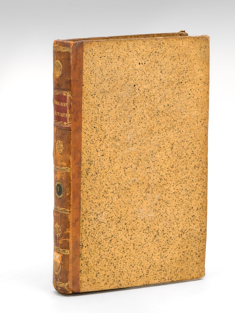 1 vol. in-8 reliure de l'époque demi-basane marron, Chez les Marchands de Nouveautés, De l'Imprimerie des Semaines Critiques, Paris, 1797 (An V), 385 pp. Ce tome 3 recueille les semaines 19 à 26 (7 numéros) de cette revue révolutionnaire publiée du 7 germinal an 5 au 16 brumaire an 6. "Remarquable autant par la finesse et la vérité des observations que par le style, tour à tour léger, gracieux et plein de force ; on y trouve cette gaieté spirituelle, ces plaisanteries fines, ce sel vraiment attique, qui distinguaient, sous l'ancien régime, les écrivains de l'excellent ton" (Hatin, 278). Bon état (reste de petite étiquette au dos en queue et en garde volante, qq. rouss., bon exemplaire par ailleurs) pour ce journal aussi rare que piquant.