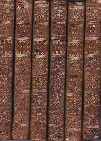 6 voll. in-8° (200x123mm), pp. (10), 343, (3); (14), 335, (3); (14), 328, (2); (14), 332, (2); (8), 345, (5); (8), 299; legatura coeva in pieno vitello marmorizzato con dorsi lisci adorni di titolo e tomaisons in oro entro doppio tassello, filetti e motivi floreali e fitomorfi in oro. Tagli rossi, sguardie marmoreggiate. Frontespizi in rosso e nero con imprese tipografiche incise su rame. All'antiporta del primo vol., ritratto calcografico applicato dello Chatelain raffigurato entro entro cornice circondata da figure sacre e putti. Fregi tipografici incisi su rame n.t. Qualche arrossatura fisiologica. Qualche piccolo restauro alle legature. Ottimo esemplare. Seconda edizione della raccolta dei sermoni sacri (ispirati a numerosi brani ed episodi del Vecchio e del Nuovo Testamento) dello Chatelain (Parigi, 1684-Amsterdam, 1743), pastore della Chiesa dei Valloni Riformati di Amsterdam. Oltre che predicatore sacro e teologo, lo Chatelain fu anche geografo, autore, col padre Zacharie Chatelain e col suo fratello minore, che si chiamava anch'egli Zacharie, di un rinomato 'Atlas Historique, ou nouvelle Introduction a l'Histoire' in 7 volumi.