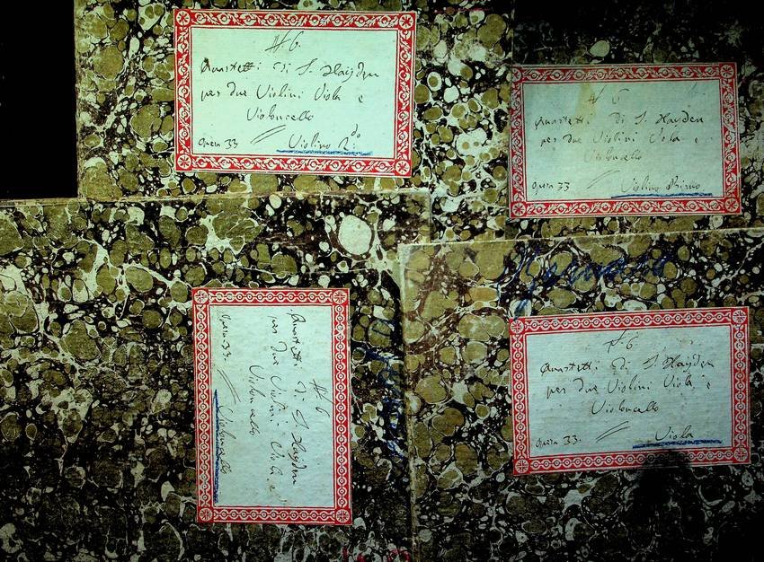 4 v. (da p. 143 a p. 197; da p. 125 a p. 151; da p. 101 a p. 123; da p. 107 a p. 127), 32 cm, cart. francese con etichettina coi titoli manoscritti. Condizioni : USATO - Stato : Buono, ordinari segni d'uso e del tempo i primi tre volumi, gora al IV, firma di possesso. Altre note : IL PREZZO SI RIFERISCE AI 4 VOLUMI INSIEME (opera completa). I sei quartetti dell'opera 33 (detti quartetti Russi), composti nel 1781 e pubblicati la prima volta nel 1782, rappresentano il punto di svolta nella storia del quartetto e possono essere considerati i primi quartetti nella perfetta forma classica. Fu lo stesso Haydn, nella sua dedica dell'op. 33 al granduca Paolo di Russia, a presentarli con le significative parole "essi sono in forma interamente nuova, come mi è riuscito di fare dopo non averne più scritti per dieci anni". RARO INSIEME SETTECETESCO COMPLETO IN TUTTE LE SUE PARTI.