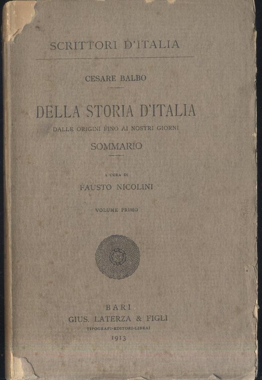 SOMMARIO DELLA STORIA D'ITALIA di Cesare Balbo 1913 Laterza libro dalle origini | Libri antichi e moderni |