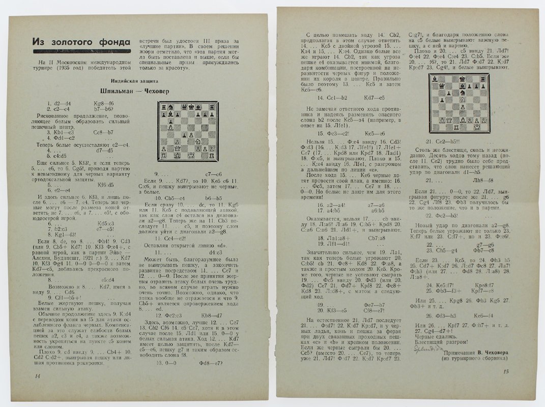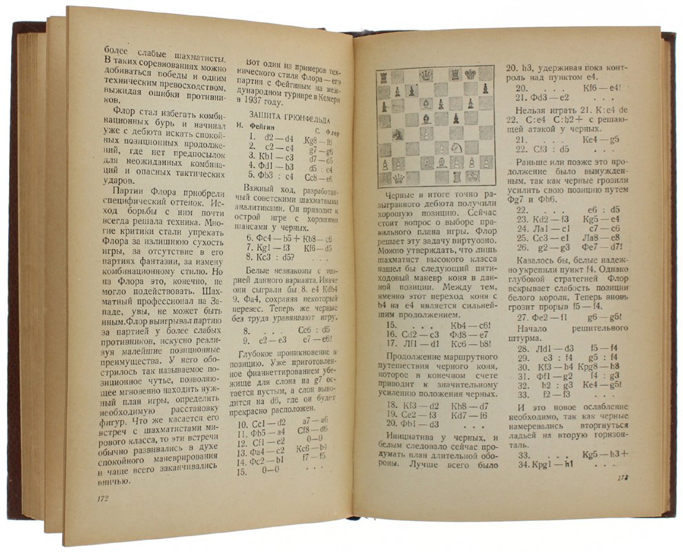 (Codice GO/1338) In 8° 328 pp. Language: russian. Chess diagrams, photographs. Edges lightly foxed. Dedication, note to pastedown. Original hardcover, embossed illustration & gilted title, fine. Joined excerpt of 2 pages (chess game Spielman-Cechover 1935) ~~~ SPEDIZIONE IN ITALIA SEMPRE TRACCIATA