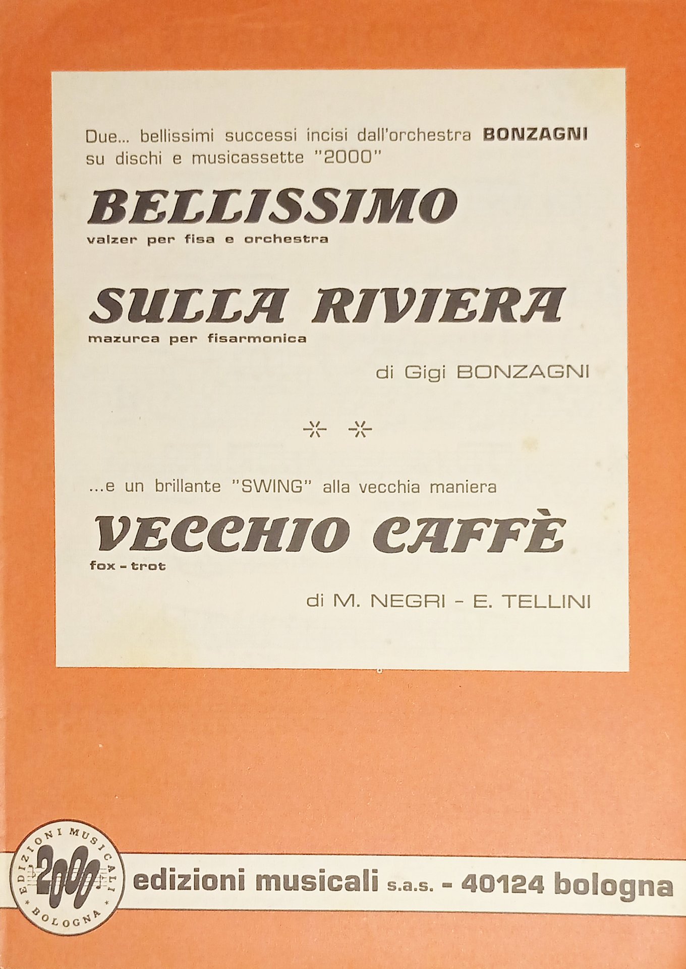 Spartiti - Bellissimo ( Valzer) per Fisa e Orchestra - Sulla Riviera ( Mazurca) per Fisarmonica di Gigi Bonzagni - Vecchio Caffè (Fox Trot) di M. Negri - E. Tellini - 1986 Formato piccolo. Pagine 16 Condizioni molto buone.
