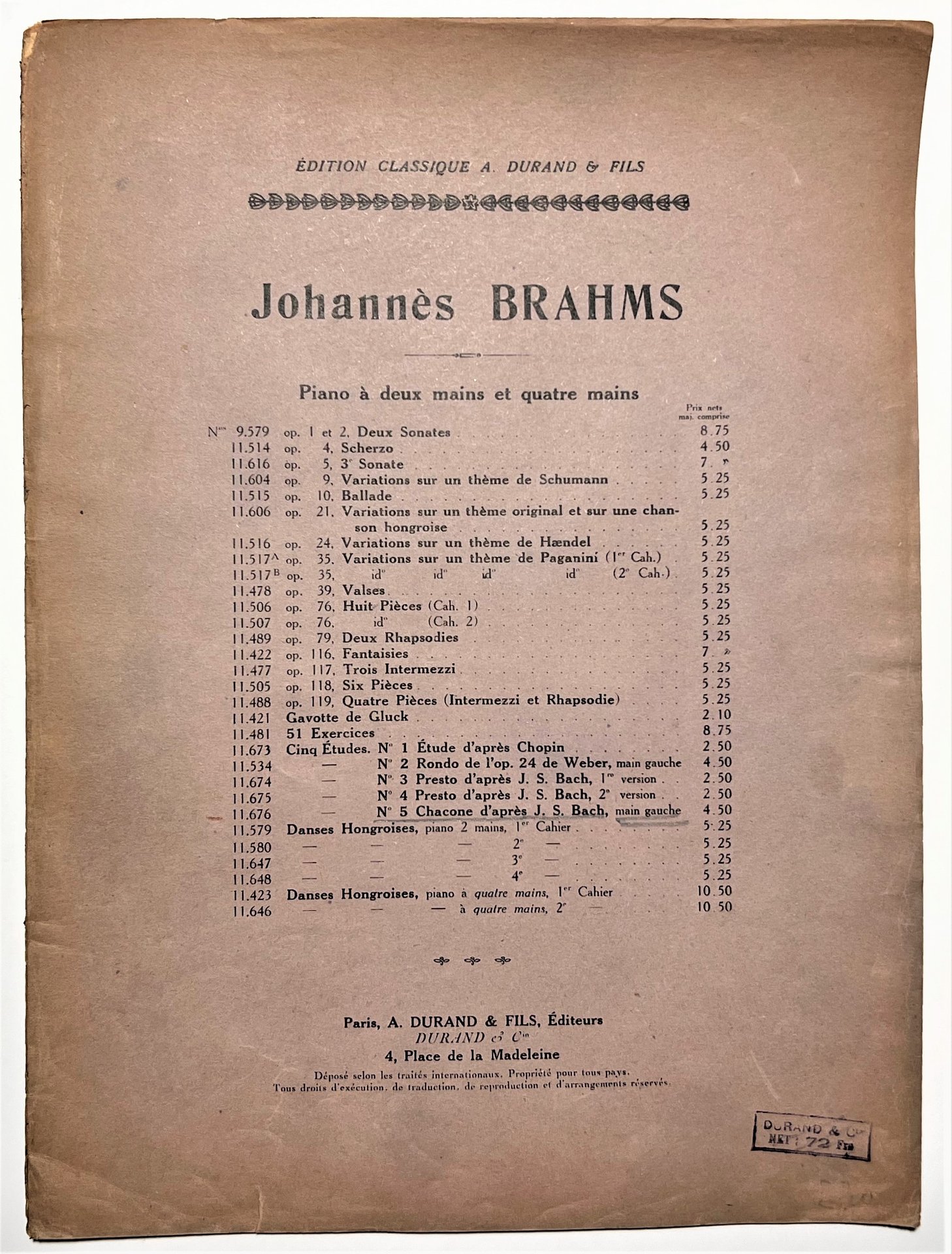 Spartiti - Chaconne d'après J. S. Bach di Johannès Brahms - ed.1929 | Libri antichi e moderni |