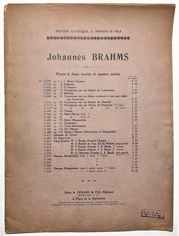 Spartiti - Chaconne d'après J. S. Bach di Johannès Brahms - ed.1929 Testo in lingua francese. Pagine 16. Formato grande. Copertina morbida. Condizioni molto buone con piccoli segni del tempo.