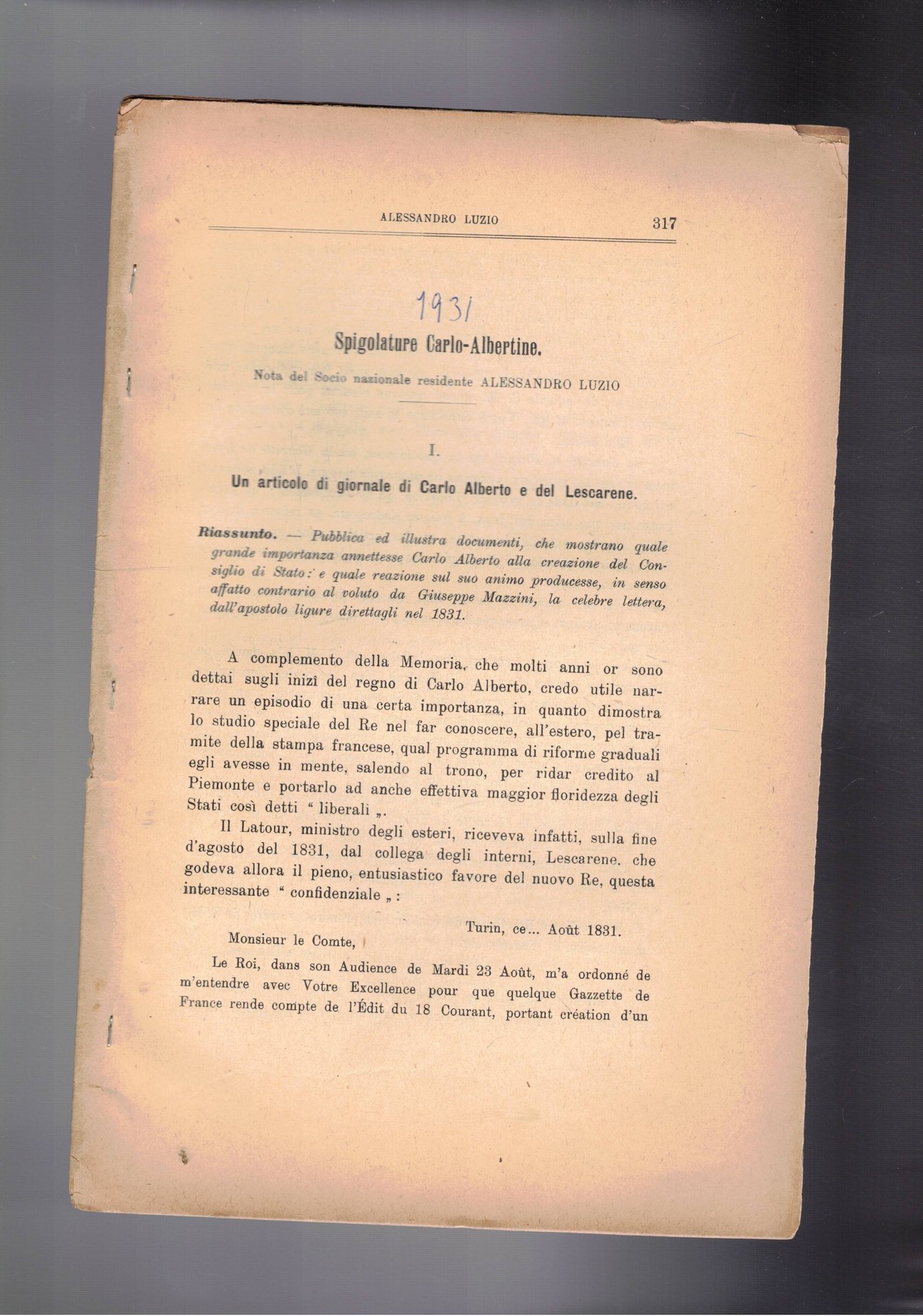 Spigolature Carlo-Albertine. Estratto che riguarda la creazione del consiglio di stato e che andava nella stessa direzione di Mazzini. | Libri antichi e moderni | Luzio Alessandro.