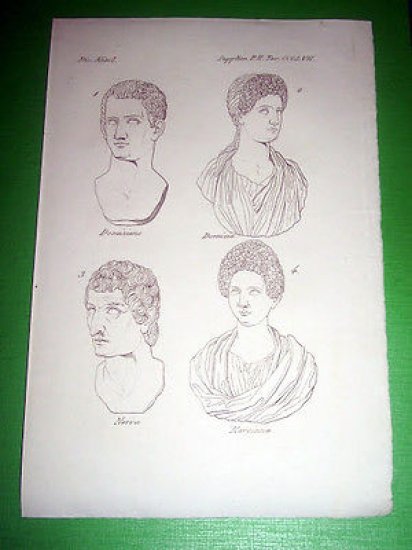 *** Stampa / incisione d' epoca Mitologia - Domiziano, Domizia, Nerva, Marciana - tavola estratta dal volume, databile 1700 ca. Dimensioni dell' intero foglio cm. 15,5 x 23,5 circa Per appassionati, studiosi e collezionisti