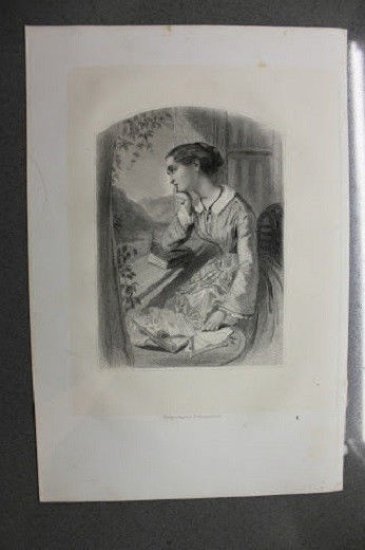Stampa incisione Ottocento ritratto di giovane donna assorta