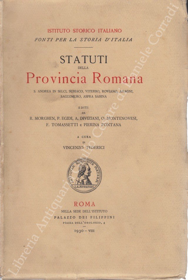 Statuti della provincia romana. S. Andrea in Selci, Subiaco, Viterbo, Roviano, Anagni, Saccomuro, Aspra Sabina. Con sette tavole illustrative | Libri antichi e moderni | Egidi P. - Federici V. - Tomassetti F. Et Alii