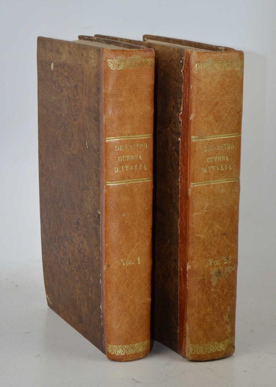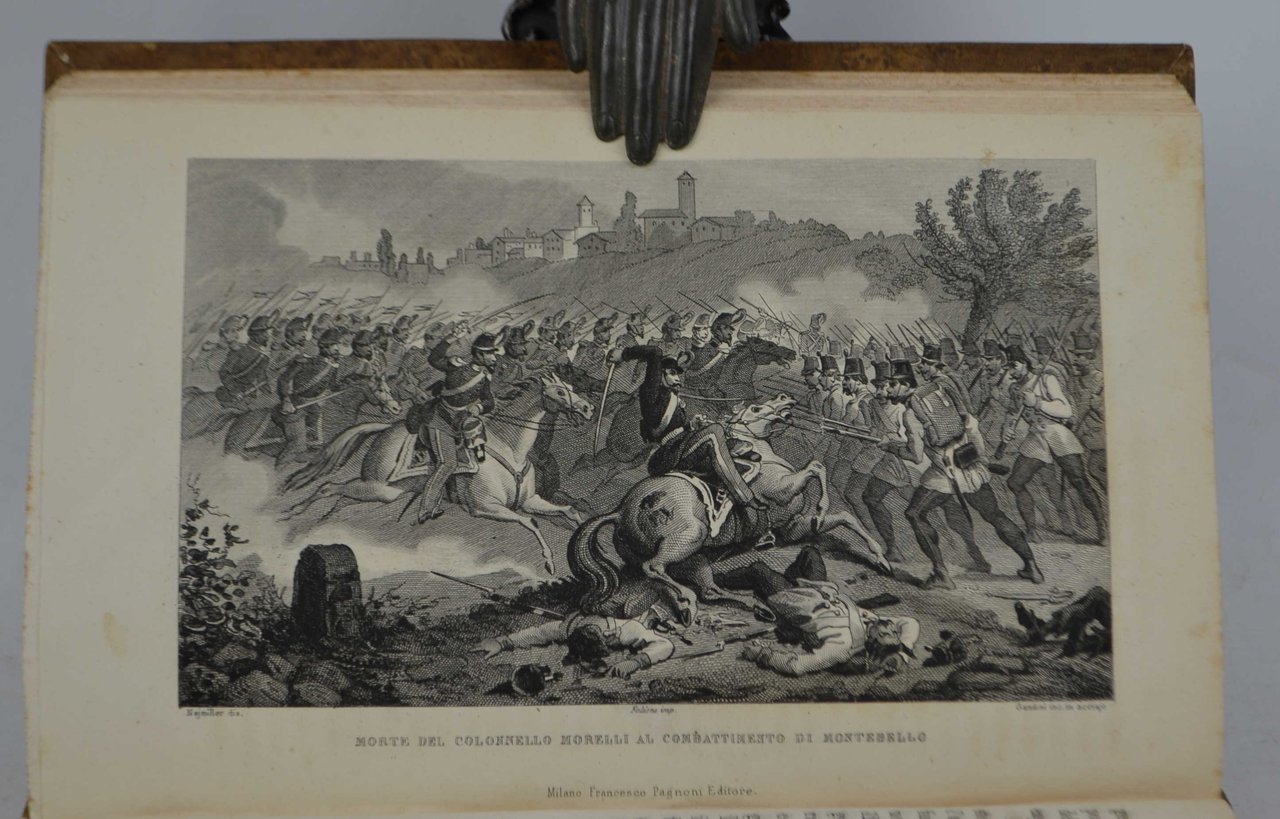 Due volumi di cm. 23, pp. (6) 400 (2); 528 (2) + 4 d'appendice. Bell'antiporta in cromolitografia a ciascuno dei due volumi, 58 tavole f.t. incise in rame (battaglie, episodi storici, ritratti, ecc) ed una grande carta geografica dell'Italia più volte ripiegata. Solida ed elegante legatura coeva in mezza pelle, dorsi lisci con titoli e fregi in oro. Esemplare particolarmente fresco e ben conservato. Non comune soprattutto quando completo di tutte le incisioni.