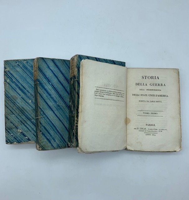 4 volumi in 8, cm 14 x 21, pp. (4) + XII + 364; (4) + 544; (4) + 554; (4) + 478. Cartonatura d'attesa con decorazione a pettine. Esemplare in barbe. Edizione originale poco comune di questa importante opera, in seguito piu' volte ripubblicata e tradotta. Botta, fiero avversario della monarchia sabauda, filofrancese, nel guardare alla storia dell'indipendenza degli Stati Uniti, pensava alla situazione italiana, ponendosi come precursore del risorgimento. Premessa una ampia introduzione che costituisce il libro primo, prosegue l'analisi delle vicende storiche secondo l'ordine cronologico, partendo dal 1765 per arrivare al 1783. Il libro ebbe anche notevole influenza negli Stati Uniti al punto di guadagnarsi gli elogi da parte di Thomas Jefferson e John Adams e l'iscrizione d'ufficio all'American philosophical society. Botta, originario di San Giorgio Canavese fu uno studente prodigio, giovanissimo si laureo' in medicina. Perseguitato dal governo piemontese, nel 1795 dovette emigrare in Francia. Tornato in Italia con l'Armata Francese, nel 1799 fara' parte  del Governo provvisorio piemontese. Con la restaurazione fu costretto a rifugiarsi in Francia e nel 1830 pubblico' la Storia d'Italia, sua opera maggiore