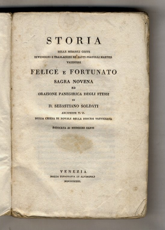 Storia delle mirabili geste invenzioni e traslazioni de' santi fratelli martiri vicentini Felice e Fortunato. Sagra novena ed orazione panegirica degli stessi (.). | Libri antichi e moderni | Soldati Sebastiano.