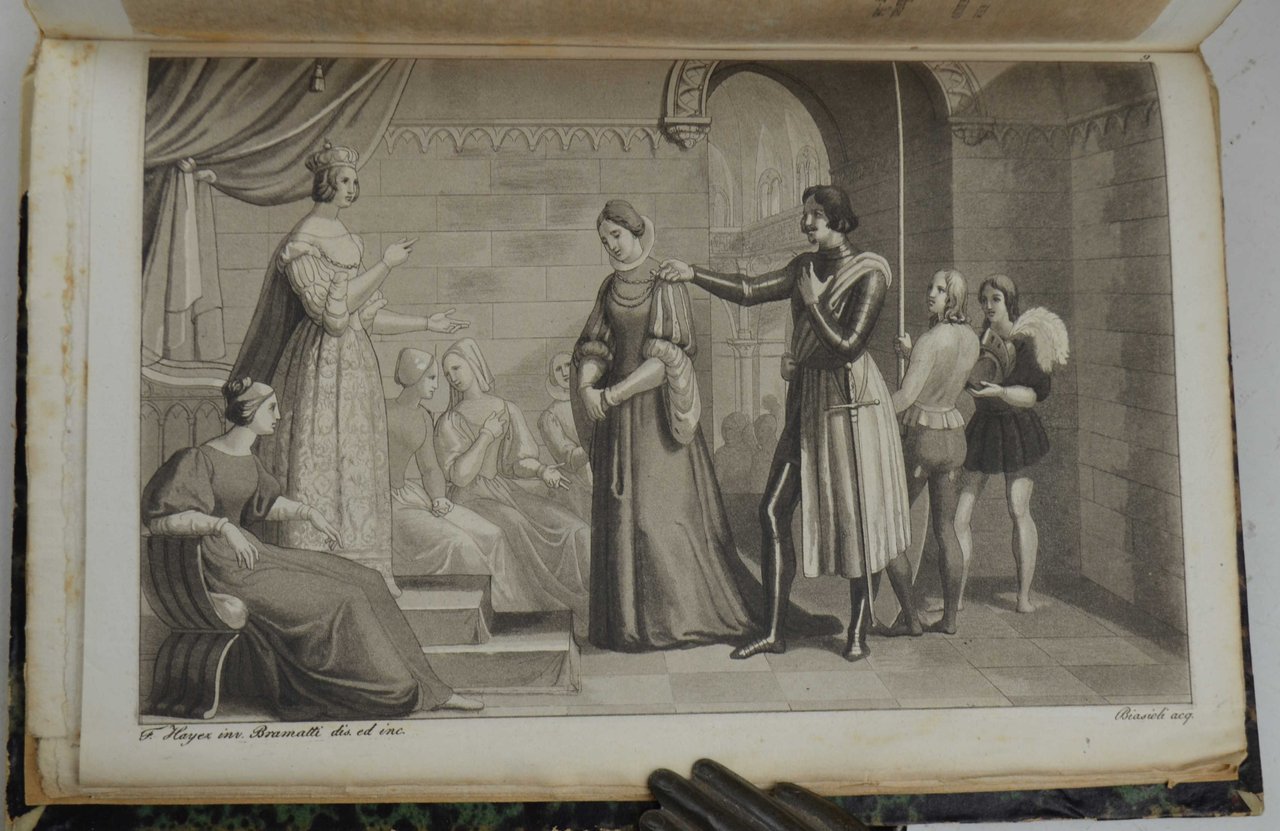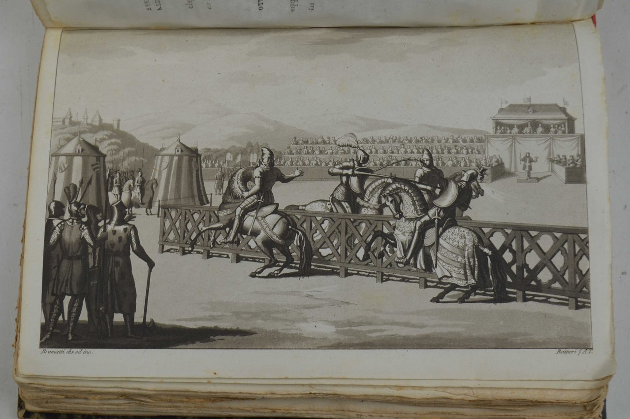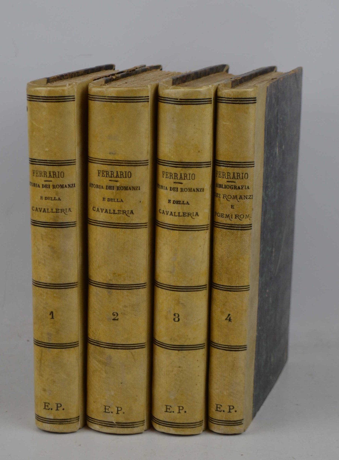Quattro volumi di cm. 23, pp. xvi, 332; 382 (2); viii, 430 (2); viii, 304. Con molte tavole f.t. all'acquatinta e tre tabelle ripiegate fuori testo. Legatura del tempo in mezza pergamena con filetti e titoli impressi ai dorsi. Esemplare marginoso e genuino, con qualche arrossatura sparsa, ma complessivemente in ottimo stato di conservazione. Il quarto volume che è opera di Gaetano Melzi e titola: "Bibliografia dei romanzi e poemi cavallereschi d'Italia", apparso come appendice un anno dopo i precedenti. Opera interessante e non comune, munita di un affascinante apparato iconografico con tavole che raffigurano la vita dei cavalieri, tornei, ecc.