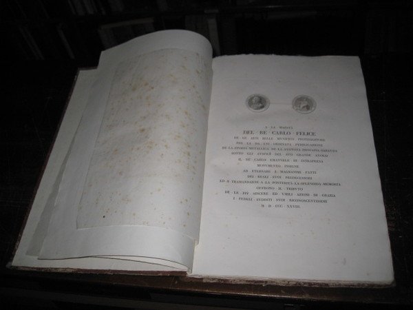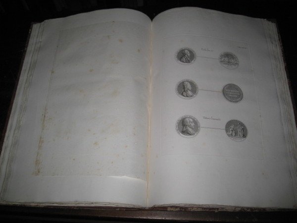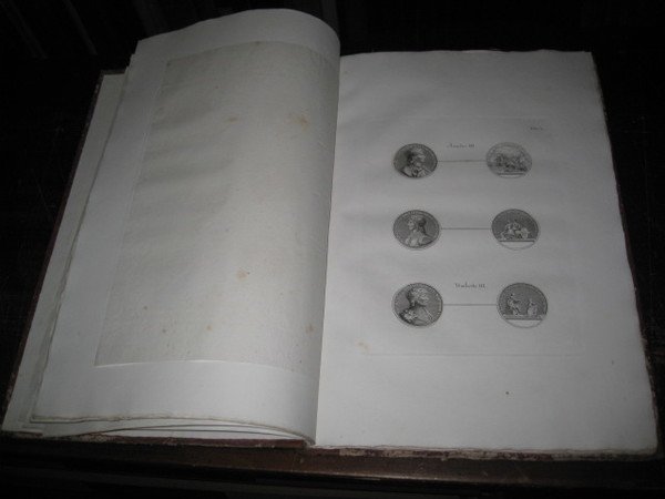 In-folio (495x320mm), cc. VIII, 116 nn., legatura coeva m. pelle con titolo in oro su tassello rosso al dorso. In antiporta, allegoria di Casa Savoia incisa all'acquaforte dal Palmieri su invenzione del Bucheron. Con 27 tavole raffiguranti medaglie con effigi dei Savoia. Dedica a stampa a Carlo Felice. Ottimo esemplare. Prima e unica edizione di monumentale opera sulla monetazione sabauda. 'Nella Storia metallica della Real Casa di Savoia, vale a dire nella spiegazione del Medagliere intrapreso per ordine di Carlo Emanuele III, quindi interrotto, e poscia ridotto a perfezionamento dalla munificenza di Re Carlo Felice, il quale volle inoltre che quella serie di Medaglie incise in rame, rappresentanti nel loro ritto i ritratti dei Conti e Duchi di Savoia e dei Re di Sardegna e nel rovescio un simbolo allusivo ad alcuna gloriosa azione di questi Principi, fosse palificata colle stampe, e corredata di note storiche' (Gazzetta piemontese, luglio 1834). Il Galeani Napione (Torino, 1748-ivi, 1830) fu insigne erudito e scrittore di diversissime materie; la sua opera più nota è 'Dell'uso e dei pregi della lingua italiana' (Torino, 1791-92). Manno, I, 575. Bassoli, Monete e medaglie nel libro antico, p. 74: 'Magnifica opera'.