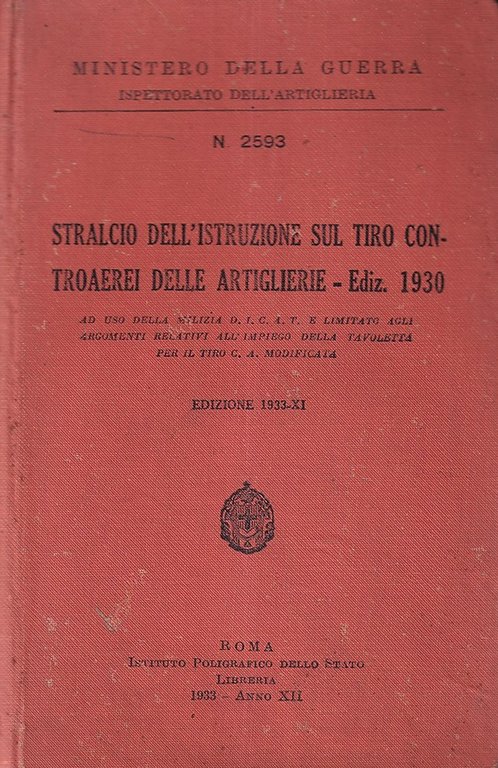 Stralcio dell'istruzione sul tiro controaerei delle artiglierie : ad uso della Milizia D.I.C.A.T. e limitato agli argomenti relativi all'impiego della tavoletta per il tiro c.a. modificata | Libri antichi e moderni | Ministero Della Guerra