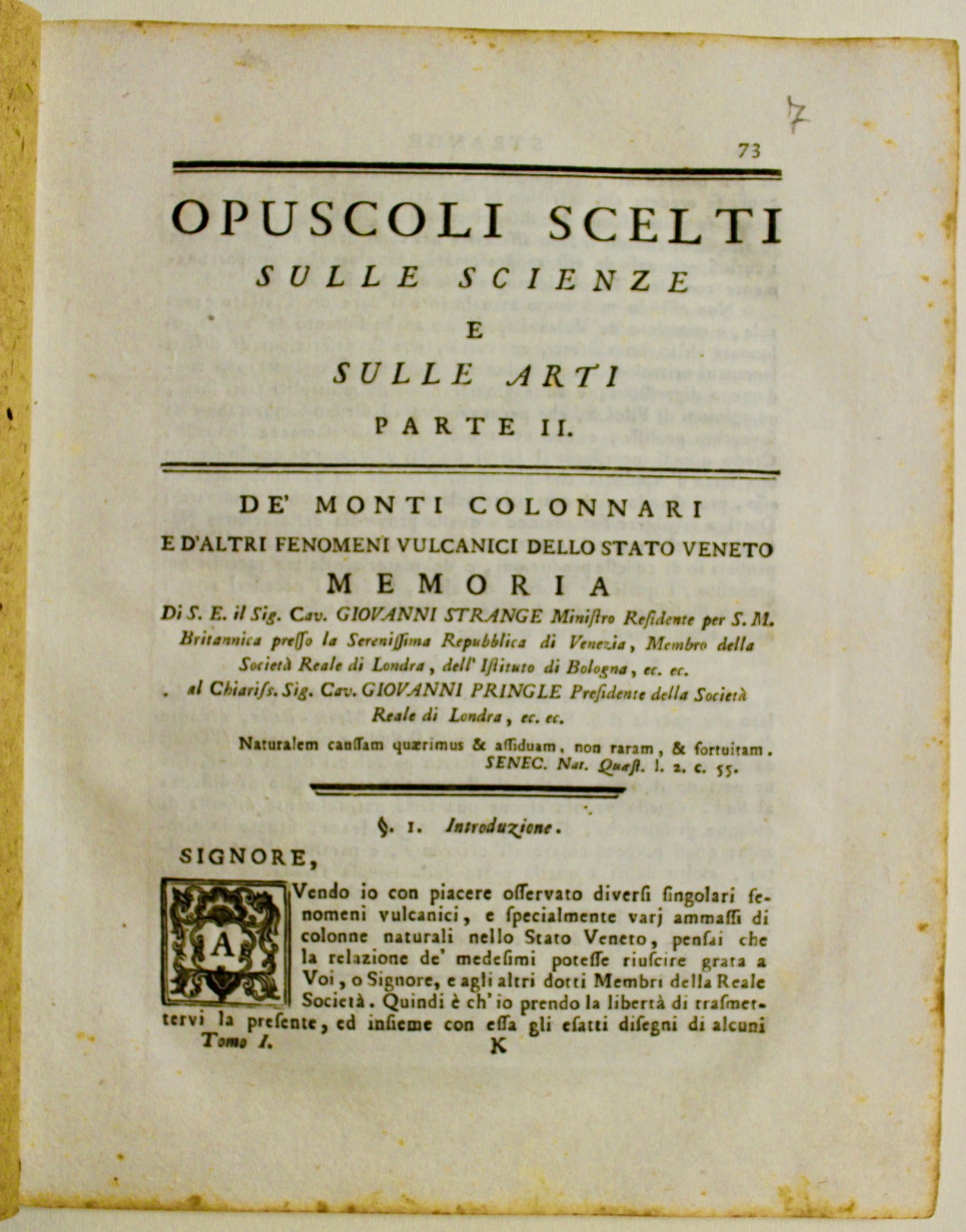 Su i diversi metodi inventati finora per preservare gli edifici dagli incendi. (insieme a:) STRANGE GIOVANNI. De' monti colonnari e d'altri fenomeni vulcanici dello stato veneto. (Insieme a:) DE TERMEYER. Sopra il pulce acquaiolo.
