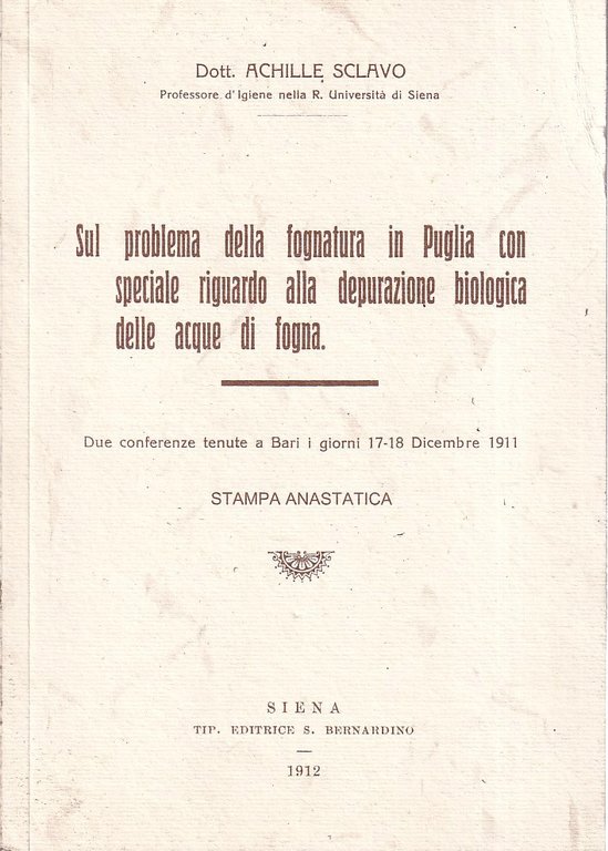 Sul problema della fognatura in Puglia con speciale riguardo alla depurazione biologica delle acque di fogna | Libri antichi e moderni | Sclavo, Achille