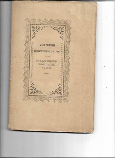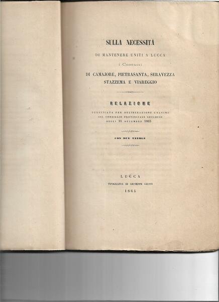 Sulla necessità di mantenere uniti a Lucca i comuni di Camaiore. Pietrasanta. Seravezza. Stazzema. Viareggio. Relazione pubblicata per deliberazione unanime del Consiglio prov. lucchese 11 dicembre 1863. | Libri antichi e moderni |